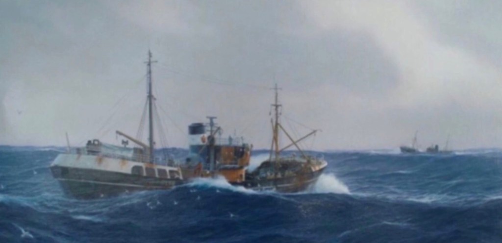 Slik kunne det se ut i den slags vær, mens den ene tråleren nettopp har fått los om bord i Honningsvåg. På vei ut fjorden med kurs for Magerøysundet og på vei mot sør, i møte med en den neste, på vei inn for å sette i land sin to loser. – Et illustrasjonsbilde