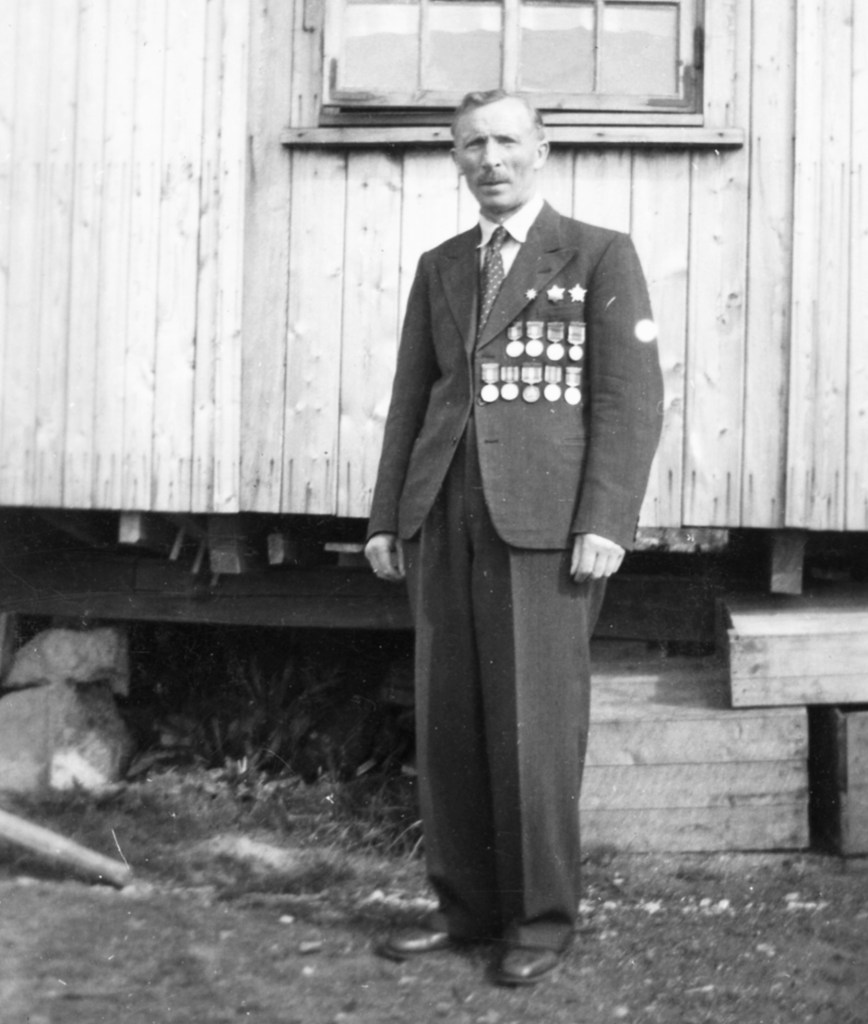 Hilmar Hansen, et tidsvitne, utenfor brakka etter at han kom nordover igjen, smykket med skytterlagsmedaljer.
