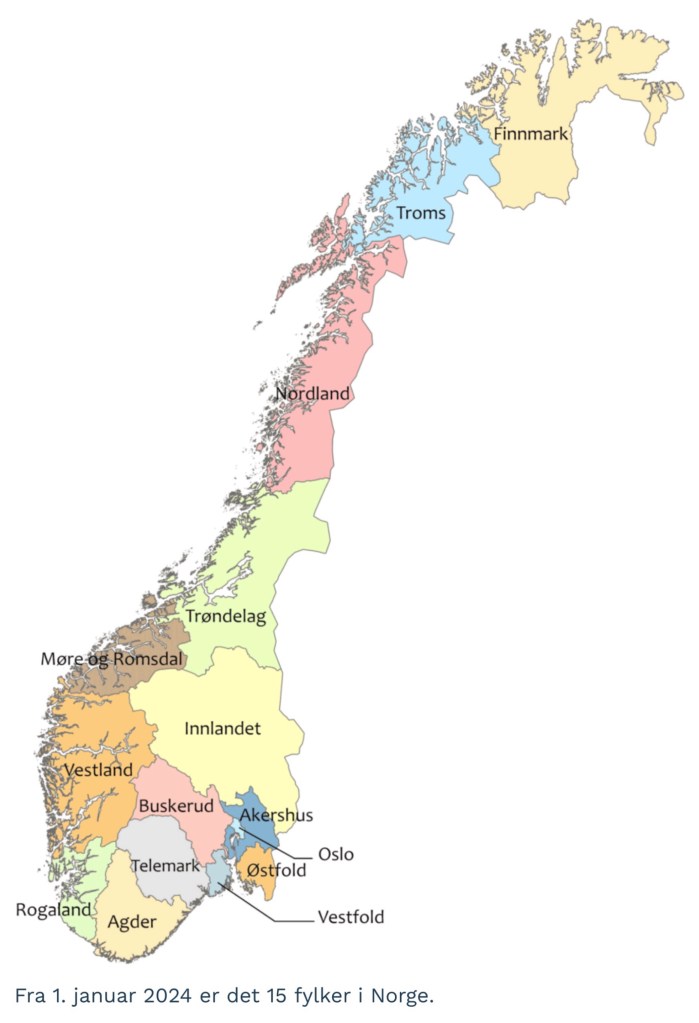På karet har vi alle landets femten fylker samlet, slik det ble fra 1. januar 2024, da Finnmark gjenoppstod for andre gang i historien.
