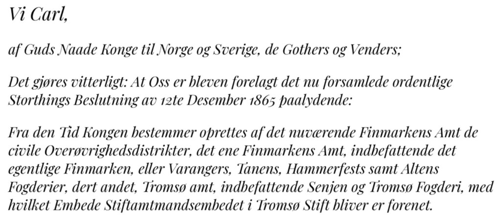 Så i låpet av det nesten hundre årende, det var i 79 år, kom kvenene til det store amtet, Finmarkens amt, et amt som da bestod av to fogderier i Nordlandenes amt, Senjen fogderi og Tromsø fogderi.