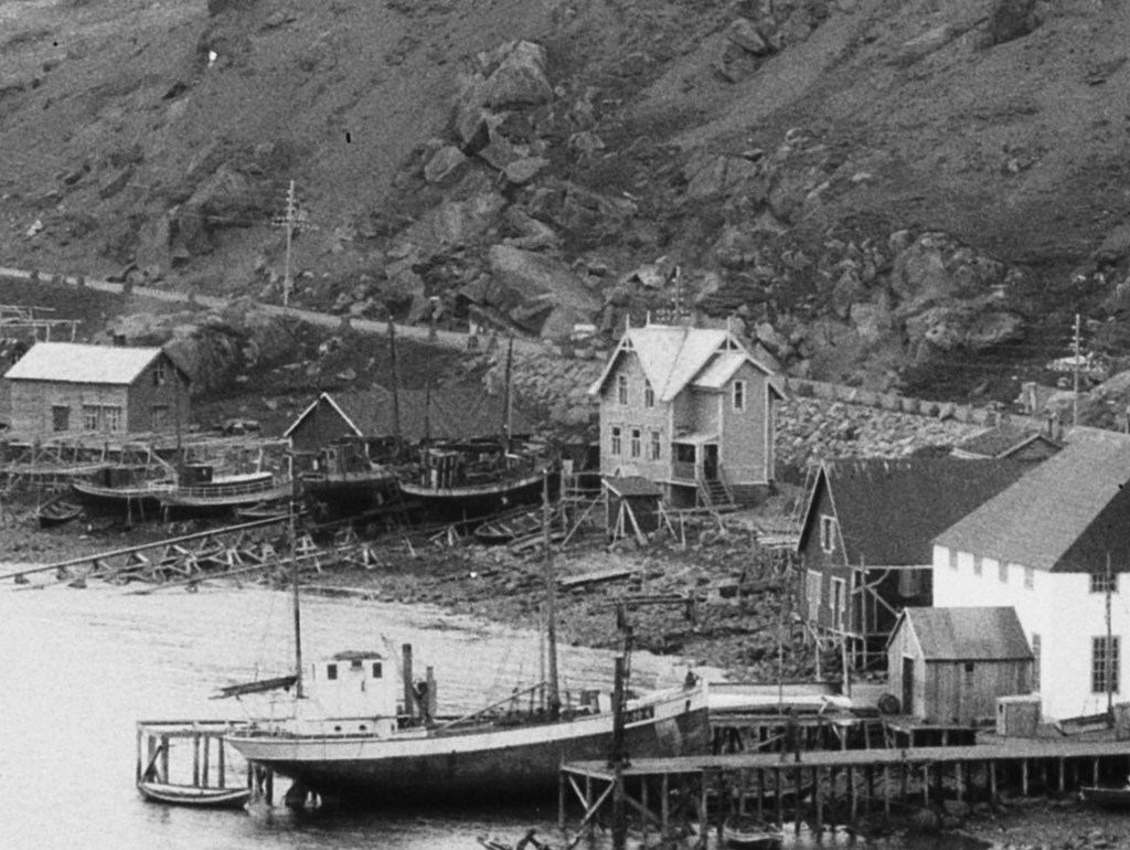 Brødrene Kristian og Sigurd Isaksens slippanlegg i Storbukt, lengst borte, slik det var frem til brenninga. Foto: Mittet / Nasjonalbiblioteket