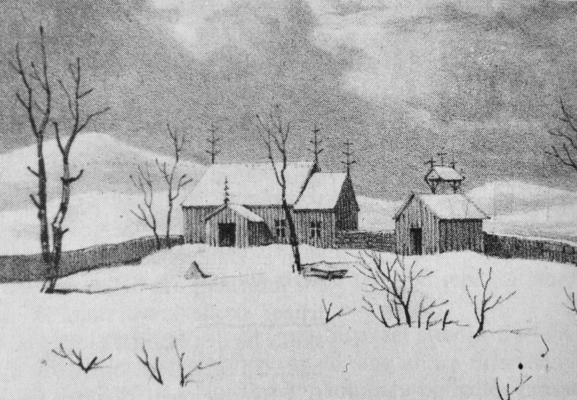 Den svenskbygde kirka i Kautokeino, fikk stå der frem til brenninga. – Foto: Arthur de Campell Brooke «A Winter in Lapland and Sweden», London 1927, via Øystein Bottolfsen «Finnmark fylkeskommunes historie 1840-1990», Vadsø 1990.