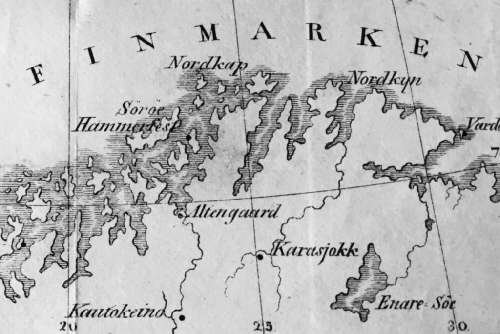 Et kart fra Keilhau, B. M (1831) Reise i Øst og Vest-Finmarken samt til Beeren Eiland og Spitsbergen, i Aarene 1827 og 1828. Tegnet av G. L. Fehr, og trykt hos Johan Krohn, Christiania 1831.
