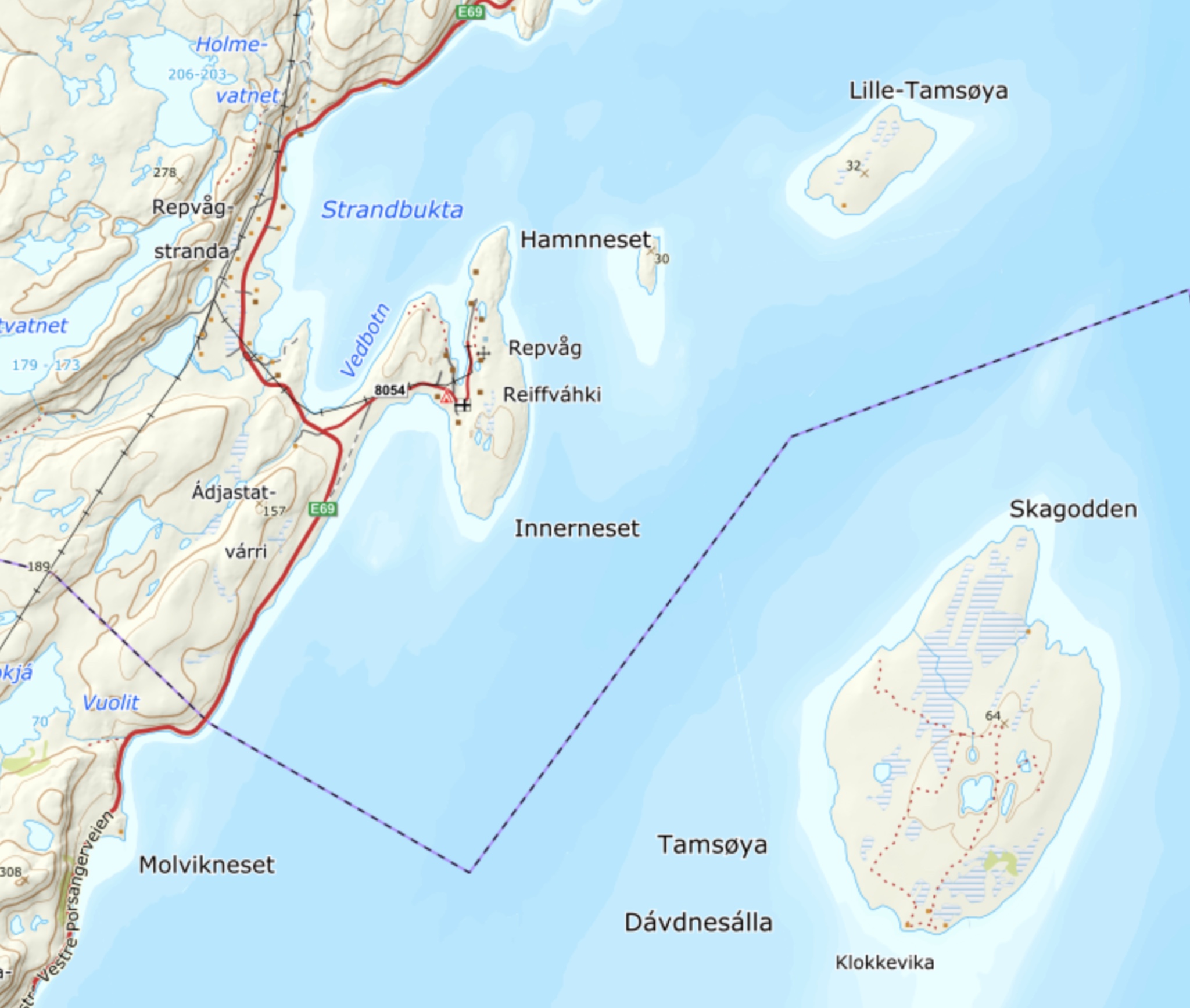 Vi ser at det høyeste punktet på Lille-Tamsøya er 32 meter over flomålet. – Et kart fra Statens kartverk.